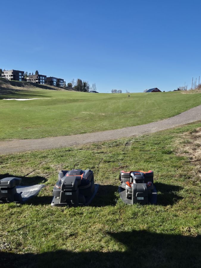 Bane kommer seg godt og robotene gjør en kjempe jobb på fairways. Vi er fortsatt i innkjøringsfasen med robotene og klippemønster og størrelse på fairways blir testet ut. Bildet vedlagt er fra robotstasjonen for de som klipper hull 8,9 og korthullsbanen. Det er roboter som klipper både fairways og rough.