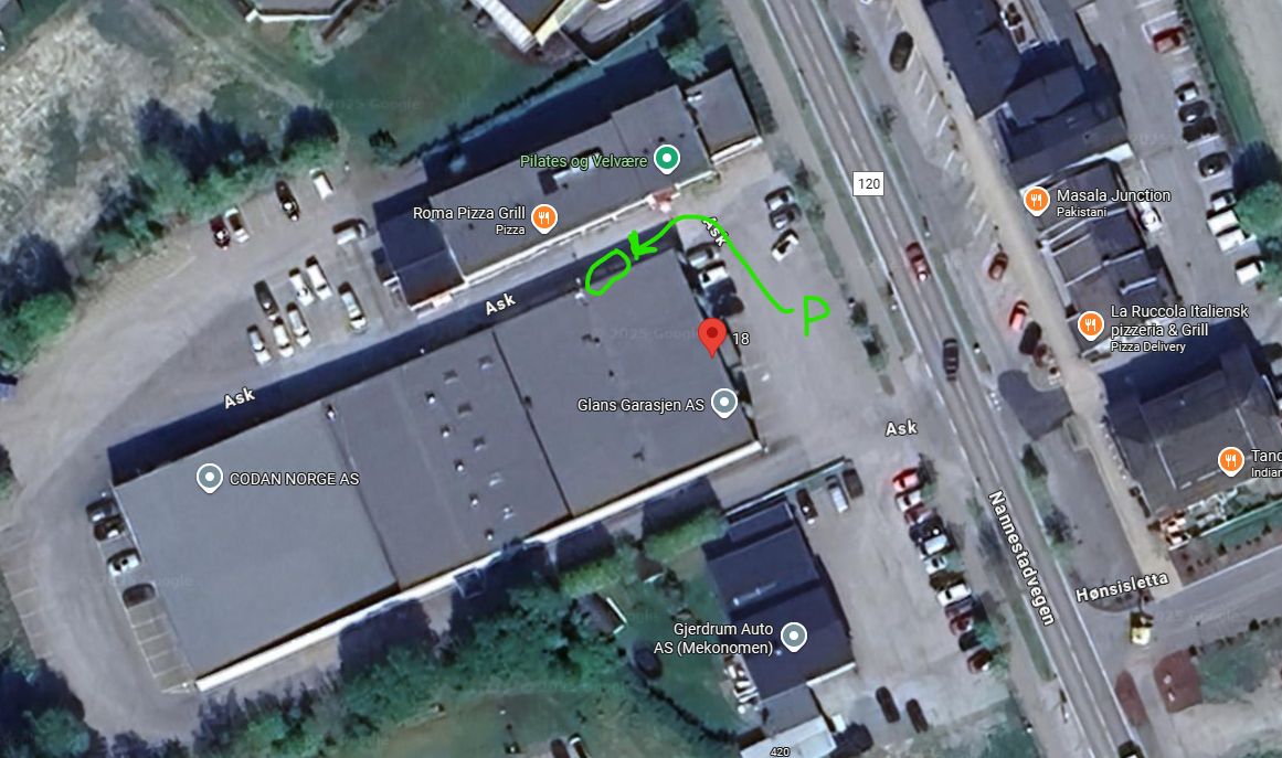 Adresse er Ask 18. Inngang på høyreside av bygget rett over for Roma pizza.
